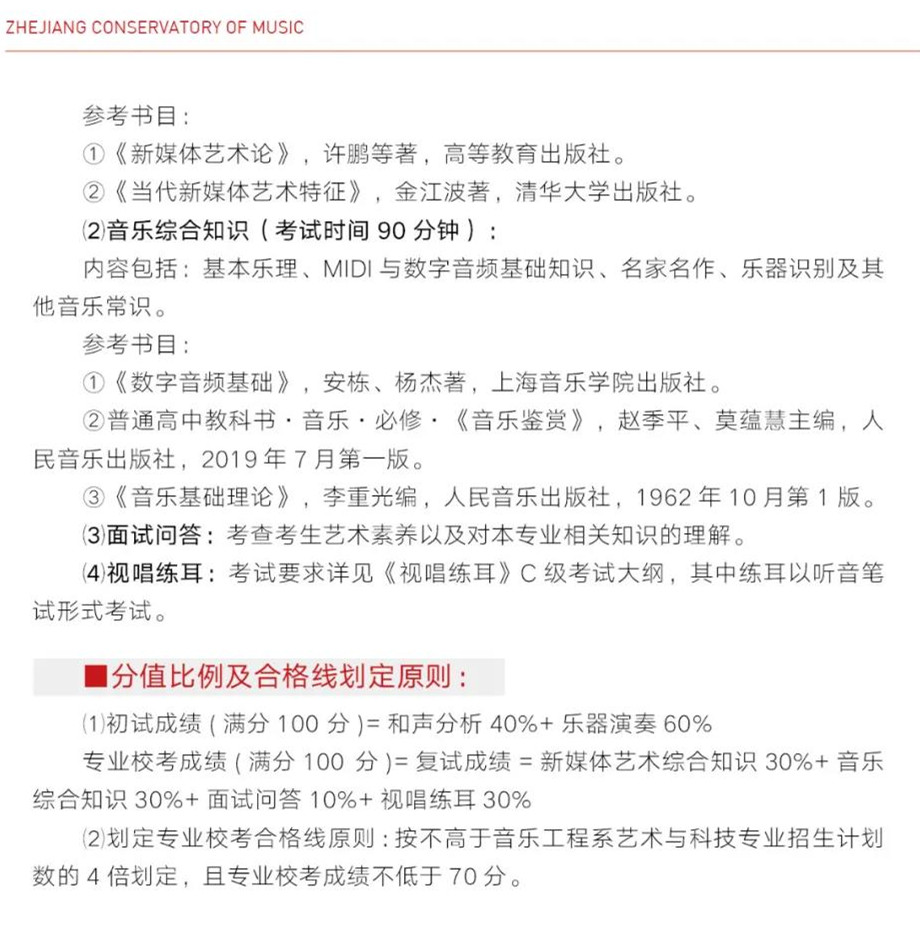 学校设有音乐与舞蹈学、艺术学理论、戏剧与影视学等3个一级学科,音乐与舞蹈学、戏剧与影视学等2个学科被列为省一流学科建设计划,其中音乐与舞蹈学为A类计划。拥有音乐与舞蹈学硕士学位授予权和艺术硕士专业学位授权点。设有作曲与作曲技术理论、音乐学、音乐表演、舞蹈学、舞蹈表演、舞蹈编导、表演、艺术与科技等8个专业,其中:音乐学、音乐表演和作曲与作曲技术理论3个专业为国家级一流本科专业建设点,其余5个专业均为省级一流本科专业建设点。设立作曲与指挥系、音乐学系、音乐教育学院、钢琴系、声乐歌剧系、国乐系、管弦系、流行音乐系、舞蹈学院、戏剧系、音乐工程系、人文社会科学部(马克思主义学院)等12个教学单位和附属音乐学校、继续教育学院、创业学院、国际教育学院、叔同学院。设有数字音乐智能处理技术文化和旅游部实验室、数字音乐浙江省工程研究中心、浙江文艺创研中心等省部级科研机构和高等音乐教育研究所、戏剧学研究所、音乐学研究所、舞蹈学研究所、艺术与文化管理高等研究院、音乐文化研究院等校级科研平台,以及乐队学院、民族乐队学院、歌剧学院、室内乐学院和合唱学院5个新型表演学科教学平台。