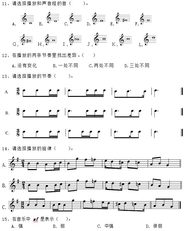主要考查考生对音高、音长、音强、音色等音的属性的基本辨别能力和音乐常识。