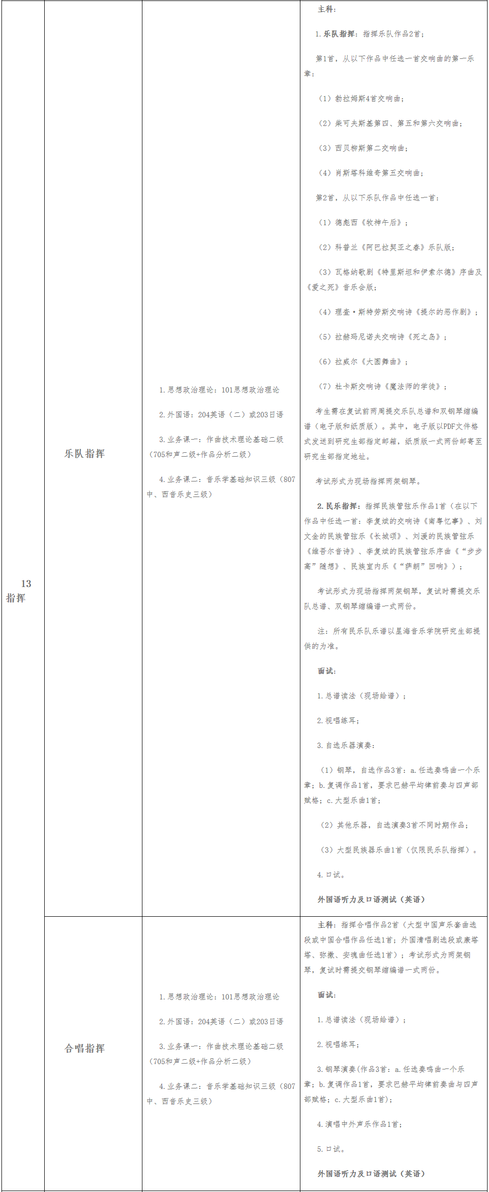3.加试科目:同等学力报考者、成人高校应届本科毕业生、自学考试和网络教育本科毕业生、非音乐类专业考生,在复试期间需加试视唱练耳(含听写、视唱两部分)与器乐演奏(自备练习曲、乐曲各一首,需背谱独奏,不带伴奏);舞蹈编导专业需加试舞蹈编导基础理论与中国民族民间舞技能测试。