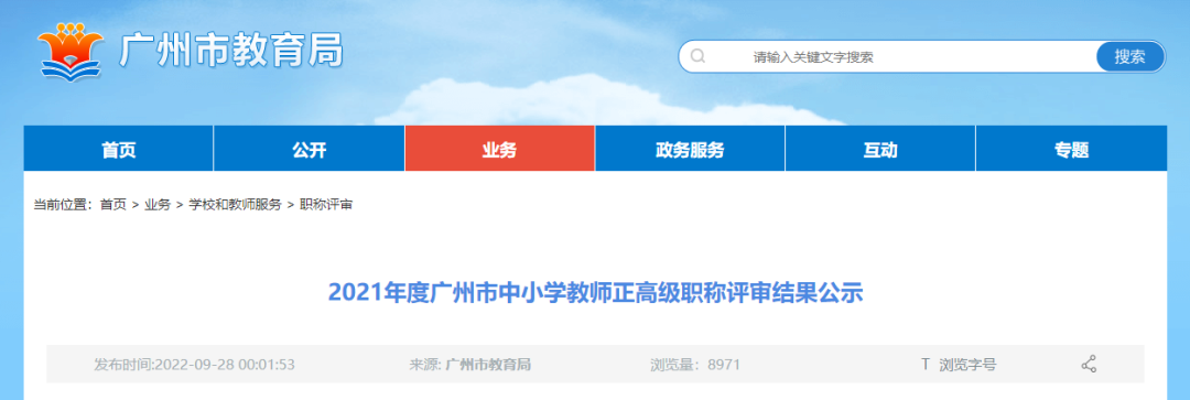 最新消息!广州市教育局对2021年度广州市中小学教师正高级职称评审结果进行公示,公示时间:从2022年9月27日至2022年10月10日止。