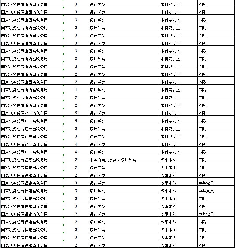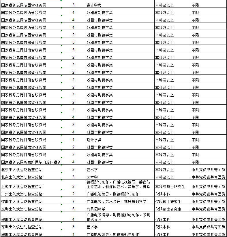 从发布的招聘简章来看,招聘单位为国家档案局、中宣部、中国文联、外交部、公安部、交通运输部、文化和旅游部、国家邮政局,国家文物局、各地铁路公安局、各地海关、各地国税局、各地出入境边防检查总站、国家统计局各地调查总队等。详情如下: