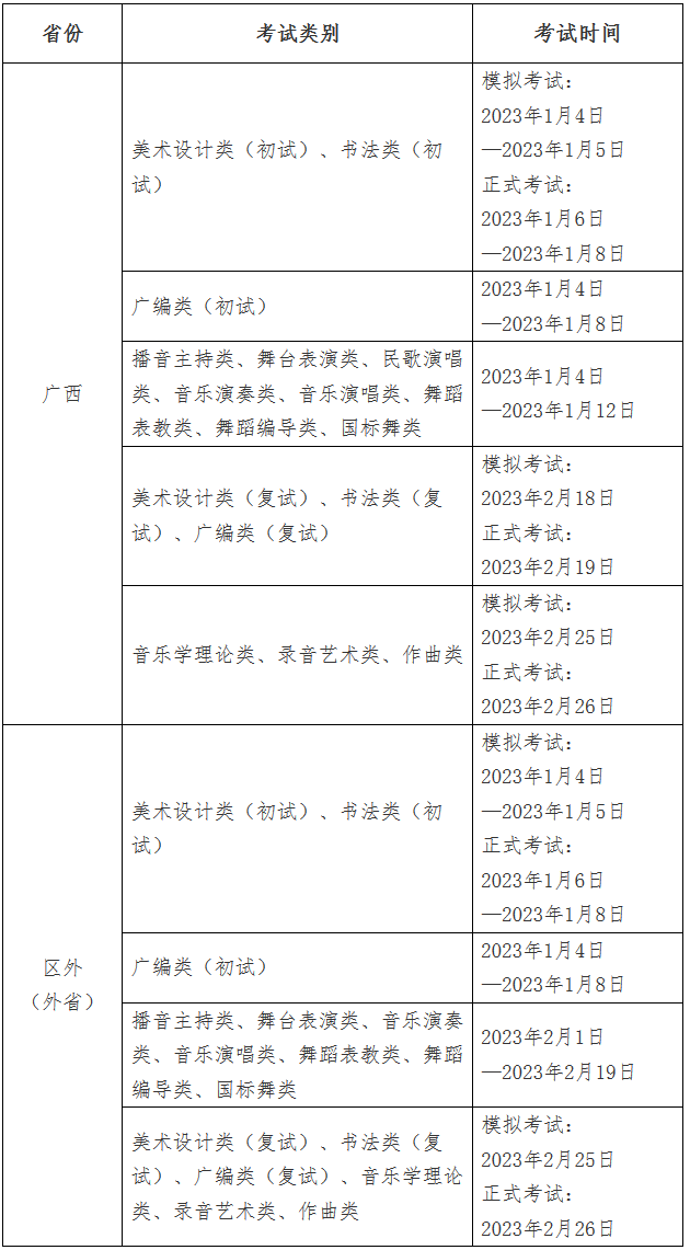 广西、区外(外省)、港澳台地区报考美术设计类、书法类、广编类、播音主持类、舞台表演类、民歌演唱类、音乐演奏类、音乐演唱类、音乐学理论类、录音艺术类、作曲类、舞蹈表教类、舞蹈编导类、国标舞类等专业的考生。
