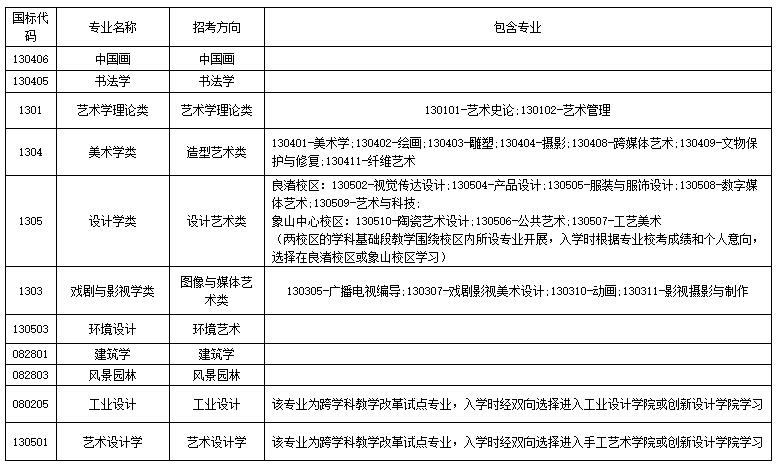 中国美术学院专业教学为基础和专业「两段式」教学模式,各招考专业大类包含专业见下表:
