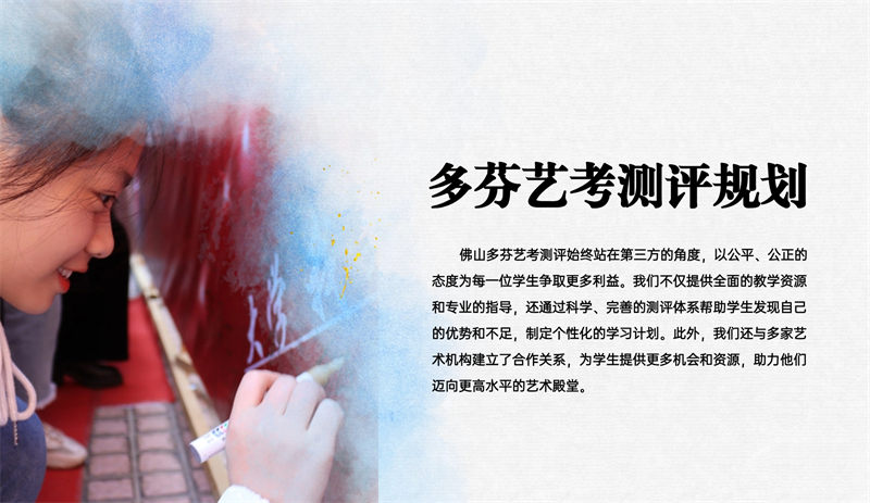 佛山多芬艺考测评始终站在第三方的角度,以公平、公正的态度为每一位学生争取更多利益。我们不仅提供全面的教学资源和专业的指导,还通过科学、完善的测评体系帮助学生发现自己的优势和不足,制定个性化的学习计划。此外,我们还与多家艺术机构建立了合作关系,为学生提供更多机会和资源,助力他们迈向更高水平的艺术殿堂。