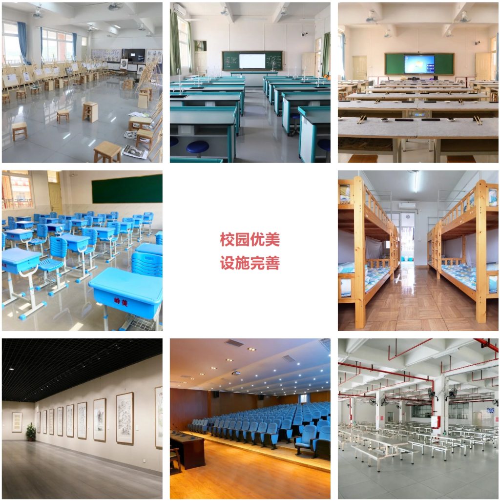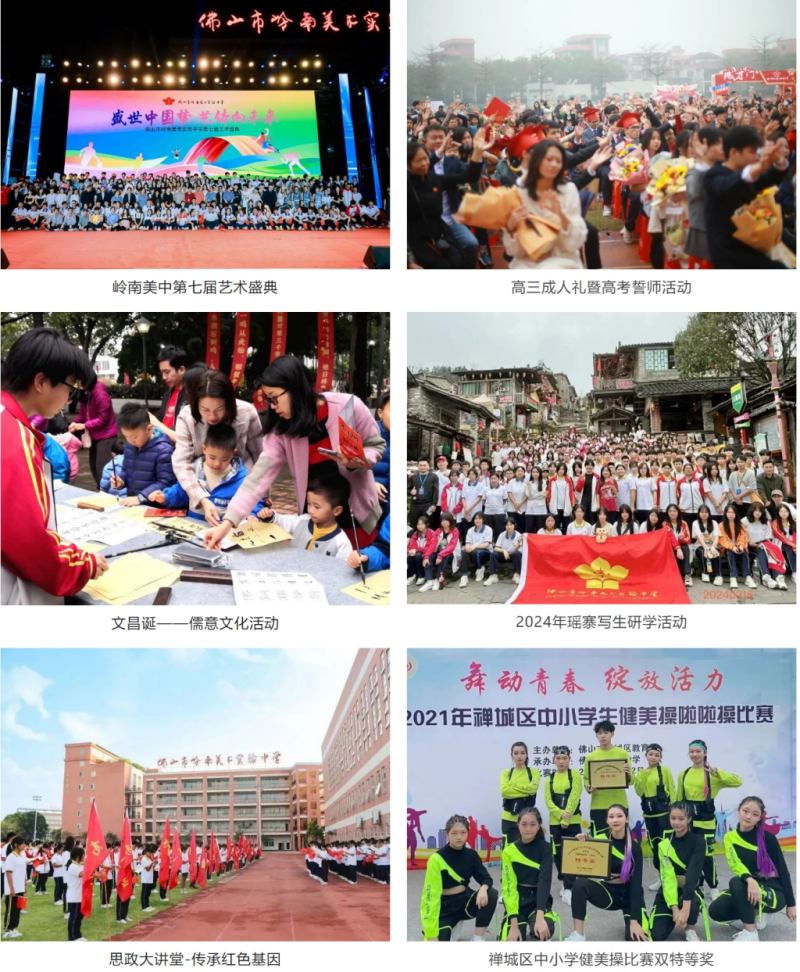 学校创办于2017年9月,是佛山市第一所以美术、书法教育为主体,兼顾音舞传体和文化教育的普通高中,是一所广受社会赞誉的艺术特色学校,广东省书法特色学校,广东省依法治校达标校,广东省绿色学校,广州美术学院美术教育学院和华南师范大学美术学院、广东工业大学教育实习基地。 学校秉承“以美育美、正气育人”的办学理念,以“良知、正气、尚美、崇文”为校训,植根于“美术+美育”为核心的“尚美文化”,让学生在浓厚的美学氛围中接受系统文化课学习和艺术教育,通过专业术科和文化科双轨教学,让学生立品成才、圆梦大学、成就精彩的人生。 办学几年来高考成绩显著,多人考上中央美术学院、中国美术学院,中央民族大学、中央戏剧学院、厦门大学、暨南大学、华南师范大学、广州美术学院、四川美术学院、星海音乐学院等重点学府,为当地教育作出了贡献。 名家领航 孔见将军 名誉校长 孔见(祥云)将军是孔子第七十五代孙,原广州军区副参谋长、少将。文武兼备的他,不仅是军功彪炳的军事专家、国之将领,更是我国当代知名书法家、中国教师书画院名誉院长、广西书法家协会名誉主席。 陈永锵 创校校长 现任中国画学会副会长、广东省中国画学会会长、中国艺术研究院美术创作研究员、中国国家画院研究员、岭南画派纪念馆名誉馆长、广州美术学院客座教授、国家一级美术师、享受国务院特殊津贴专家。 张桂光 校长 早年师从岭南名宿朱庸斋、李曲斋先生习诗词、书法。现任广东省书法家协会主席、中国书法家协会篆书专业 委员会副主任、中国古文字研究会理事、广东省文史馆馆员。 名师掌舵 陈国光 执行校长 毕业于华南师范大学生物系,广东省特级教师,广东省“百千万工程”名师,广东省中小学心理健康教育优秀教师,全国教育管理创新优秀人物。曾任佛山市高明一中校长、高明实验中学校长,广东省校长培训中心客座教授,中国教育学会会员,广东省教育学会理事,广东省中小学生物教育专业委员会理事,广东省教师专业技术高级职务第四评审委员会副主任,广东教育现代化专业委员会理事,广东省普通高中教学水平评估专家,佛山市生物学会教育专业委员会理事长,佛山市教育科研专家评审委员会委员,佛山市教育系统高层次人才,佛山市生物教学学科带头人,佛山市知名校长。 岭南美中十分重视师德建设,倡导立德树人的根本任务,秉持“爱生 严谨 善诱 创新”的教风,通过组织学习先进教师事迹、树立优秀教师典型,严格实行岗位考核等方式助力教师不断提升师德修养、提高专业水平,为岭美学子的未来保驾护航。 岭美团队 名师荟萃 师资力量是一所学校核心的竞争力,学校所有教师均具有本科或以上学历。大部分教师长期活跃在高考备考教学一线,积累了深厚的教学经验。 环境优美 设备一流 以人为本的服务管理队伍,打造出安全有序的校园环境。 学生宿舍:学校实行全封闭全寄宿管理,设有8人间学生宿舍,有专职生活老师管理,班主任、年级和德育处成员共同协助,开展精细化的管理。宿舍室内宽敞明亮,空调、衣柜、双洗手间、热水淋浴系统一应俱全。 学生、教师饭堂:厨卫设备一流,饭菜色香味俱佳;荤素搭配,营养丰富,卫生快捷。 党建引领 五育并举 学校努力打造“尚美”特色德育系列活动,将德育活动化,活动常态化,让学生在活动中实践,在实践中感悟,在感悟中学习,促进学生德智体美劳五育并举。 特色教育 课程设置 我校高中文化课程设置符合新高考改革要求,以促进学生专业化发展为目的,实行选科走班,符合学生的个人爱好、特长与未来职业规划。 岭南美中已具备美术、书法等体艺生完善的发展课程体系。 本学年学校招生计划分为文化生和艺体特长生两大部分,其中文化生招生占60%,艺体生招生数占40%,文化生课程严格按国家新课程体系对标新高考要求开设。 实行分层教学,针对不同基础的学生情况制定专门的教学方案,分层走班教学、选科走班、因材施教。 建立学习激励机制,激励学生不断进取,勇攀高峰,在学生群体中形成你追我赶的积极学习氛围,帮助有潜力的文化生实现大学梦。 即使是体艺零基础的文化生,亦可转报读美术、书法等专业班,学校将从零教起,系统教学,让学生能在高考赛道上换道超车,共圆梦大学。 岭美学子 优秀风采 (近两年部分名校录取学生) 办学几年来高考成绩显著,多人考上中央美术学院、中国美术学院,中央民族大学、中央戏剧学院、厦门大学、暨南大学、华南师范大学、广州美术学院、四川美术学院、星海音乐学院等重点学府,为当地教育作出了贡献。 高中招生 收费标准 01 志愿填写 文化生(文化生录取后可转体艺生) 体艺生:美术、书法、音乐、体育、传媒、舞蹈 02 收费标准 撰稿、编辑 | 刘玉媚