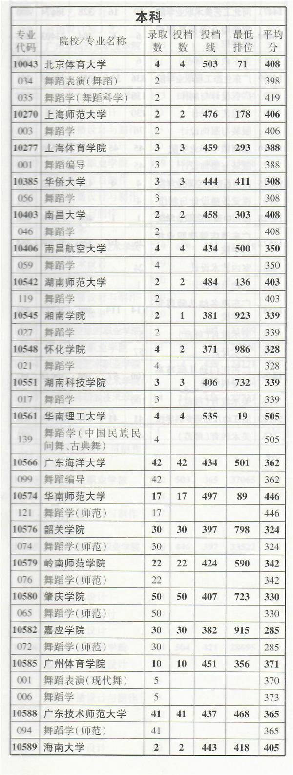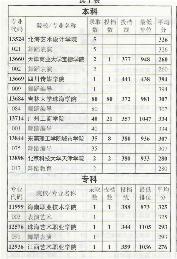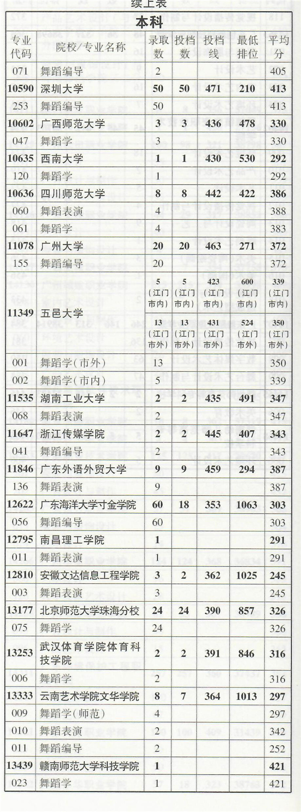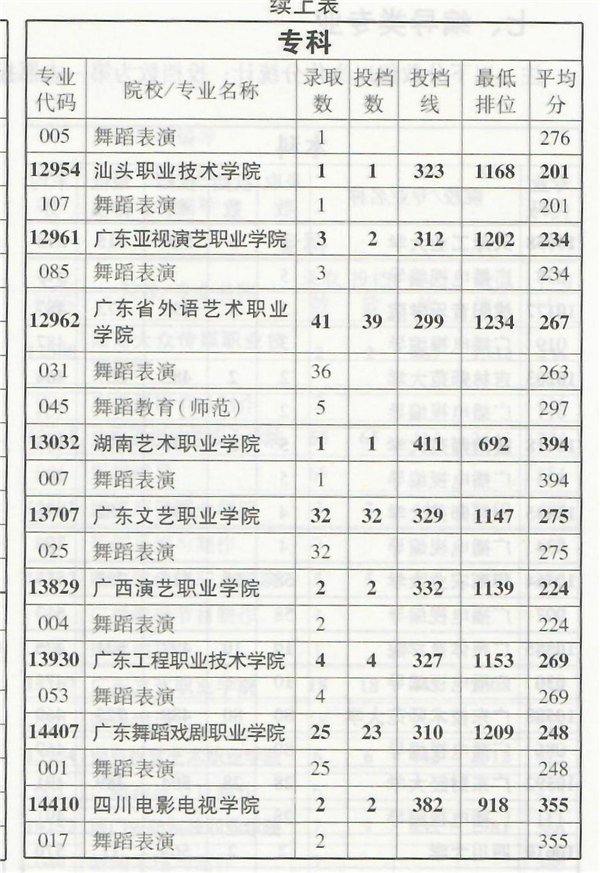 2019年舞蹈类专业部分在粤招生院校录取情况统计