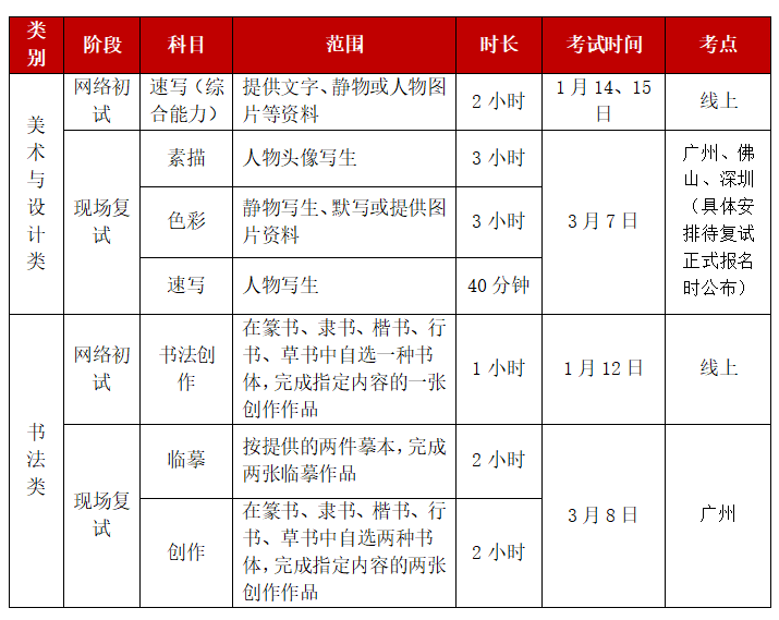 一、 招生计划 学校根据办学定位,优化专业结构,合理拟定2026年普通本科招生计划,面向全国招收全日制本科生。最终招生专业、招生计划数以上级主管部门审定下达为准。 经批准组织校考的艺术类(校考)专业不编制分省计划,即按全国计划招生。 艺术类(省统考)专业、普通类专业均编制分省分专业招生计划。 (点击查看大图) 备注: (1)面向高考综合改革省份,我校招生专业选考科目要求如下: ①艺术类(校考)、艺术类(省统考)、建筑学、风景园林、艺术设计学、艺术管理、艺术教育专业:“不提选考科目要求”; ②工业设计、智能交互设计、智能工程与创意设计专业:考生必须选考物理、化学2门科目方可报考; (2)考生可登录我校官方网站www.gzarts.edu.cn或官微GAFA_ZS查阅各招生专业介绍及课程设置等信息。 (3)学校地址 大学城校区地址:广东省广州市番禺区大学城外环西路 168 号; 佛山校区地址:广东省佛山市禅城区禅港西路西北侧、紫洞西一路南侧。 二、 报考条件 1、遵守中华人民共和国宪法和法律; 2、具有高级中等教育学校毕业或具有同等学力; 3、身心健康,符合教育部、原卫生部、中国残疾人联合会颁发的《普通高等学校招生体检工作指导意见》体检要求; 4、其他符合教育部报考规定的,可以报考。 5、下列人员不能报考: (1)具有高等学历教育资格的高校在校生,或已被高校录取并保留入学资格的学生; (2)高中阶段学校非应届毕业的在校生; (3)在高中阶段非应届毕业年份以弄虚作假手段报名并违规参加普通高校招生考试(包括全国统考、省级统考和高校单独组织的招生考试,简称高校招生考试)的应届毕业班学生; (4)违反国家教育考试规定,被给予暂停参加高考处理且在停考期内的人员; (5)因触犯刑法受到刑事处罚、尚在处罚期内的。其中:未成年人按相关法律规定执行; (6)不符合普通高考报名条件的其他人员。 三、 艺术类(校考)专业招考办法 我校艺术类(校考)专业按“网络初试+现场复试”模式组织校考,校考类别分“美术与设计类”“书法类”,最终按“美术与设计类”“书法类”分别发放校考合格证。考生初试合格后,方有资格参加复试。请考生认真理解报考方式及专业录取原则,根据个人实际情况,合理选报。 1、初试 (1)考生选择“美术与设计类”“书法类”其一进行报考,不能兼报; (2)报名时,考生务必慎重选择校考类别,报名确认成功后,校考类别不能修改。因未认真阅读招生简章,导致校考类别选择错误,或不能被录取的责任由考生自负。 (3)学校根据各校考类别的报名总人数,分场次组织网络远程考试。 (4)初试合格方有资格参加复试,初试成绩不计入复试,也不作为专业录取因素。 (5)学校根据初试成绩,分别按不超过“美术与设计类”“书法类”招生计划数的8倍划定“美术与设计类”“书法类”复试资格线,具备复试资格的考生须在规定时间内完成复试报名确认,否则视为放弃复试资格。学校保留根据复试名额缺额情况按初试成绩依次递补复试资格考生的权利。 2、复试 (1)初试合格的考生,按对应的校考类别重新报名确认后,方可参加现场复试。 (2)学校根据教育部相关规定,按“美术与设计类”“书法类”两个校考类别分别发放校考合格证,合格证发放数不超过“美术与设计类”“书法类”对应招生计划数的4倍。 (3)若考生报考的校考类别所对应省级统考科类成绩不合格,则校考专业成绩无效。 四、 校考组织 1、考试纪律 (1)考生在参加校考专业考试过程中,必须遵守国家高考考试纪律及《广州美术学院考场规则》等相关规定。 (2)考生必须诚信考试,不得出现请人替考、互换答卷等违规违法作弊行为,对违反考试管理规定和考场纪律,影响考试公平、公正行为者,按《国家教育考试违规处理办法》(教育部33号令)、《中华人民共和国刑法修正案(九)》等相关条例处理。 2、初试、复试考试安排 (1)各考试科目要求详见我校已公布的《广州美术学院2026年普通本科招生考试大纲》,其中:考生参加“美术与设计类”网络初试《速写(综合能力)》须自备8开素描纸;参加“书法类”网络初试《书法创作》须自备四尺四开(69cm x 34cm)宣纸; (2)现场复试科目由学校提供画纸;有关现场复试报名及组考等安排,以我校后续官方发布的公告为准。 3、网络初试组考办法: (1)时间安排: “美术与设计类”网络初试报名结束后,我校将根据报名总数及学校组考实际情况划定每场考试容量,考生须在“确认考试场次”阶段自行选择参加考试的场次,每场次额满为止,考生只能选择其他有剩余考位的场次;如报名总数超过学校原两天组考最大容量,我校拟于1月16日加开考试场次,具体以后续正式公告为准;未在“确认考试场次”阶段选择场次的考生,我校将随机为其安排考试场次。 “书法类”网络初试仅安排1月12日一场考试,考生无需选择考试场次。 (2)考生必须在规定时间内完成相应报名手续,未按规定流程报名或报名手续不全的视为报名不成功,不得参加考试,责任由考生本人承担。 (3)报名系统: 使用电脑网页浏览器打开网页版报名系统https://user.artstudent.cn/login进入报名程序;或手机上安装使用“艺术升”APP进行报名。(注:如果忘记密码,可以通过【忘记密码】中的【短信验证】或【客服申诉】找回密码。) (4)网络初试报考流程、模拟考试及正式考试场次安排等,详见