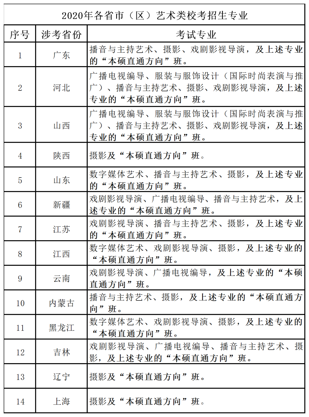 一 、艺术类专业校考涉考省份及专业