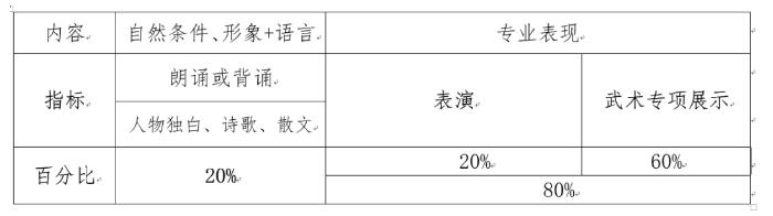 1、身体形态:对考生的身高、体重、相貌气质等条件进行综合评定。2、基本素质:考察肢体的软开度、搬腿、下腰、原地点步翻身接串翻身、斜线平转、斜线大跳。3、舞蹈剧目:自选一段舞蹈表演(应试舞种为中国古典舞、中国民族民间舞、当代舞。自备音乐及服装道具,时间不超过1分钟)。