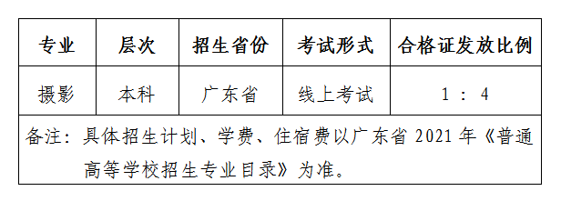 2021年摄影专业校考招生仅限已取得普通高等学校招生报名资格的广东省艺术类考生。根据专业需要,摄影专业不招色盲、色弱考生,请夜盲考生慎重报考。