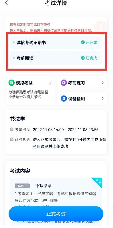 考生须在规定考试时间点击【正式考试】,请仔细阅读“考试内容”、“拍摄要求”、“拍摄时间”、“注意事项”等内容,然后进行以下操作。