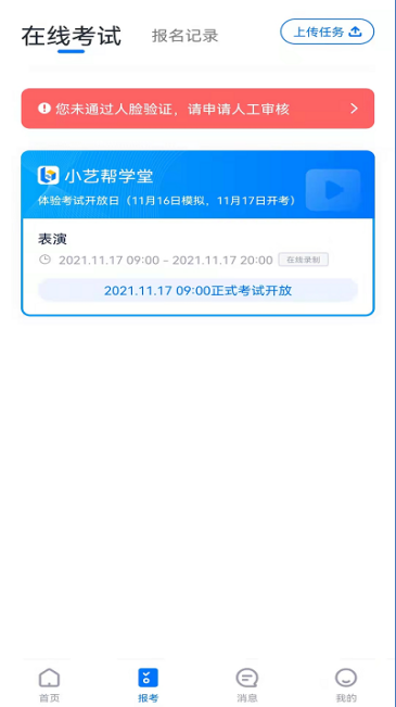 首次视频考试前需要进行人脸验证,注意【报考】页面屏幕上方红色条,点击开始验证,按提示进行人脸验证,验证完成后方可参加考试;根据语音提示进行人脸识别,不要化浓妆、戴美瞳等,验证时调整好光线,不要出现高曝光的情况,保证人脸清晰,避免人脸识别失败。