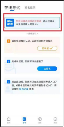 认证通过后,【报考】页面会出现您有待确认的考试,请点进去确认考试。