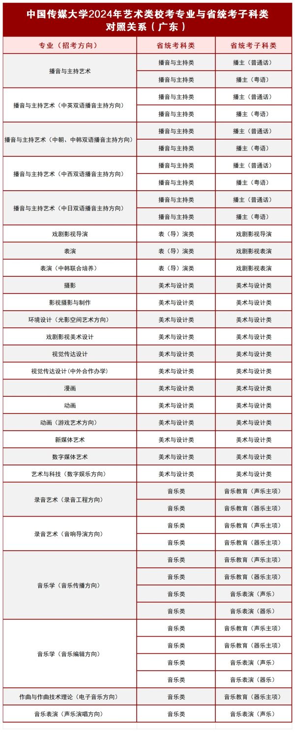 中国传媒大学2024年艺术类校考专业与广东省统考子科类对照关系