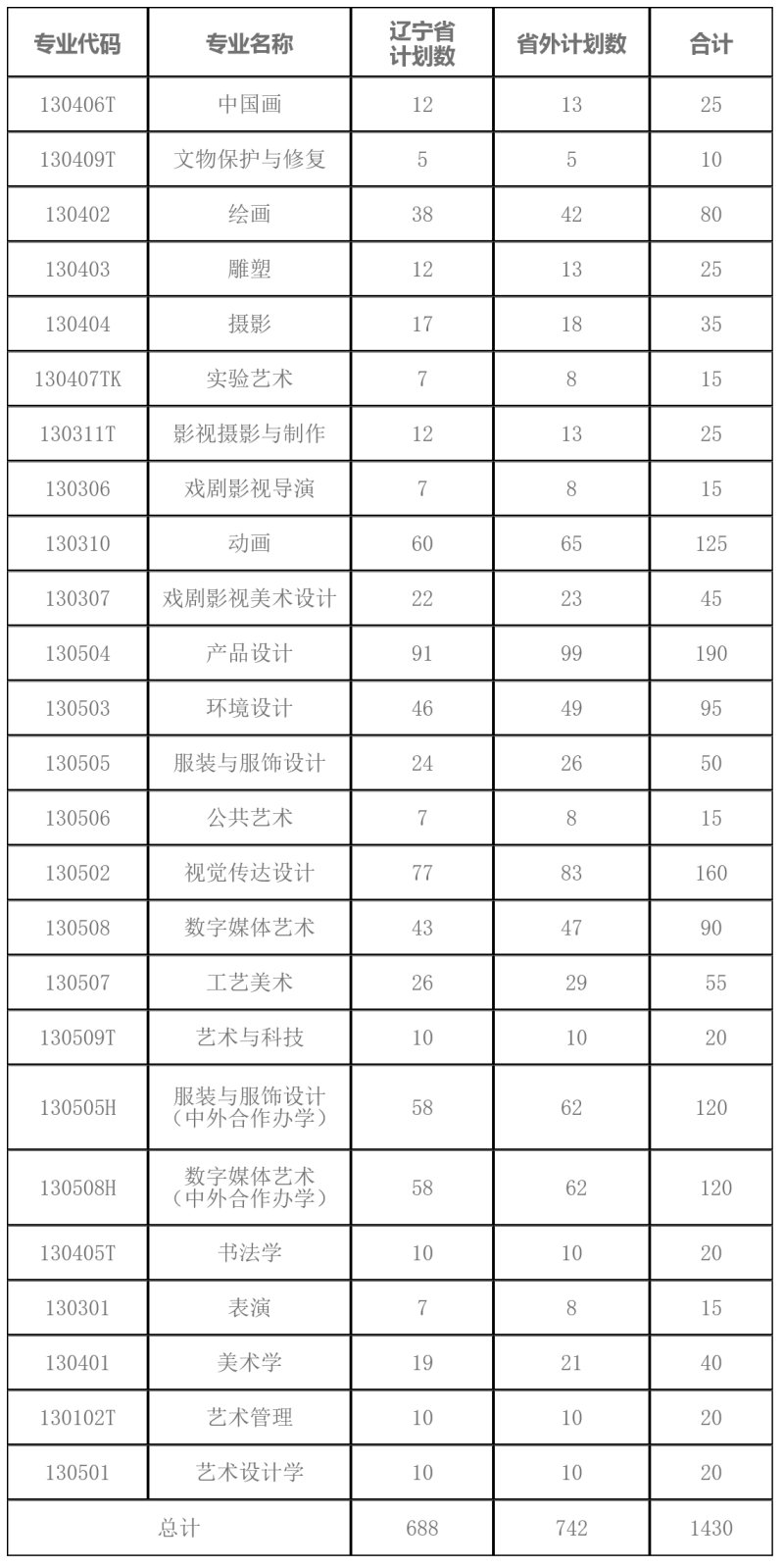 学校是辽宁省重点支持的国内一流大学建设单位,中国画、绘画、雕塑、产品设计、视觉传达设计、动画、摄影、环境设计、服装与服饰设计、工艺美术专业被评为国家级一流本科专业建设点;数字媒体艺术专业被评为省级一流本科专业建设点。学校与国际上30余所艺术院校建立了友好校际关系,并经教育部批准,分别与日本文化学园文化服装学院、英国索尔福德大学开展合作办学。