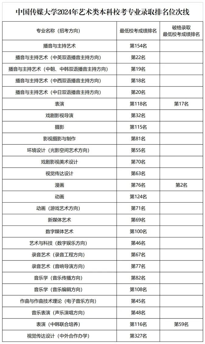 中国传媒大学2024年艺术类本科校考专业录取排名位次线