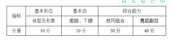 3、成绩评定:满分20分,每个动作5分,搬腿动作根据考生在动作静止状态时呈现的姿态、开度和稳定性进行评分。下腰动作根据考生脚跟与手指的距离、腿部姿态及腰部柔韧等方面进行评分。