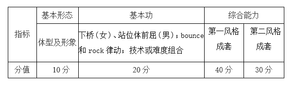 (2)bounce和rock律动考核主要通过动作的力度、幅度、质感、协调性以及节奏感进行评分。