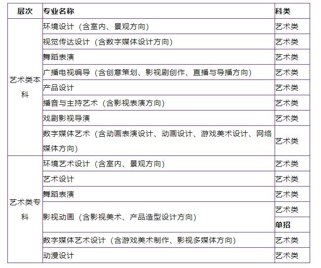 报考艺术类专业的考生,须参加艺术类专业考试,报考视觉传达设计、环境设计、产品设计、数字媒体艺术本科专业,环境艺术设计、艺术设计、影视动画、数字媒体艺术设计、动漫设计专科专业的考生须参加美术与设计类专业考试;报考广播电视编导、戏剧影视导演专业的考生须参加编导类专业考试;报考舞蹈表演本(专)科专业的考生须参加舞蹈类专业考试;报考播音与主持艺术专业的考生须参加播音与主持类专业考试。