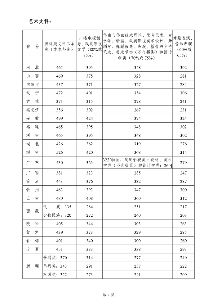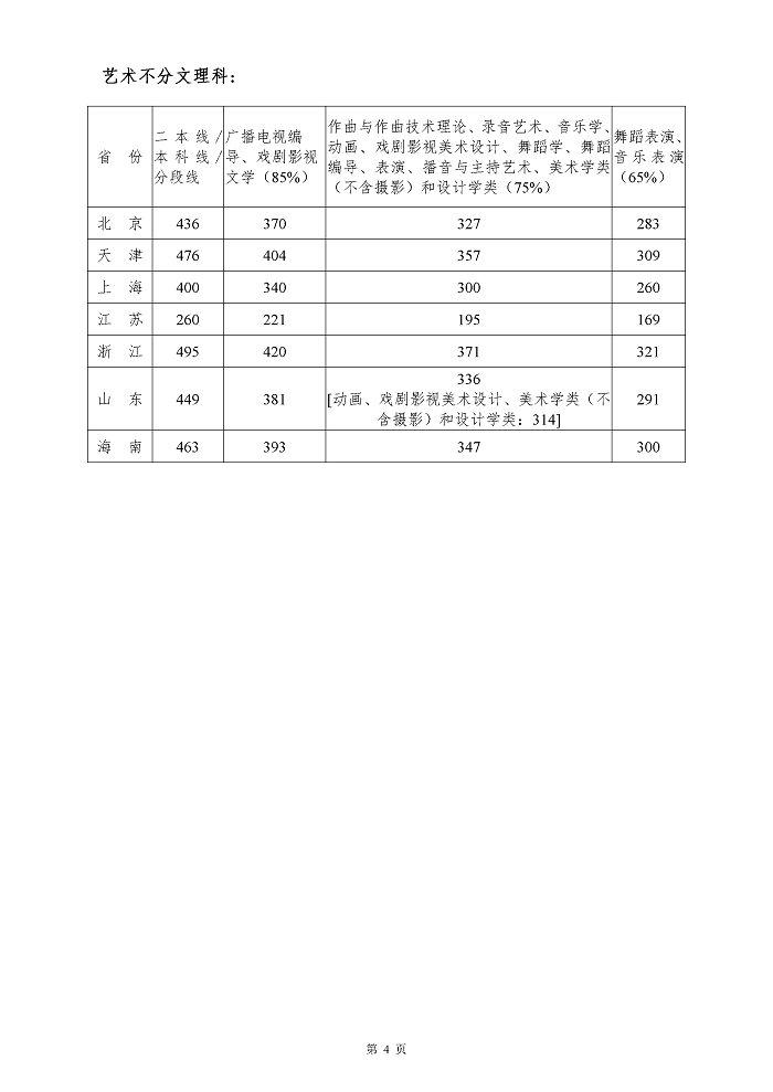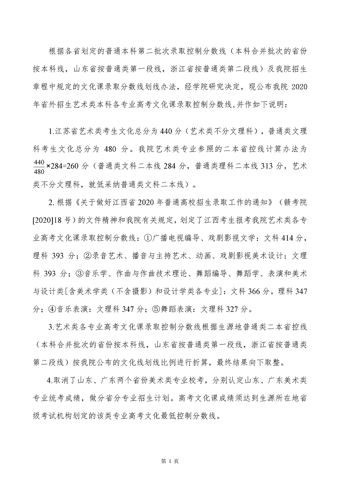 四川音乐学院2020年省外招生艺术类本科各专业文化课录取控制分数线