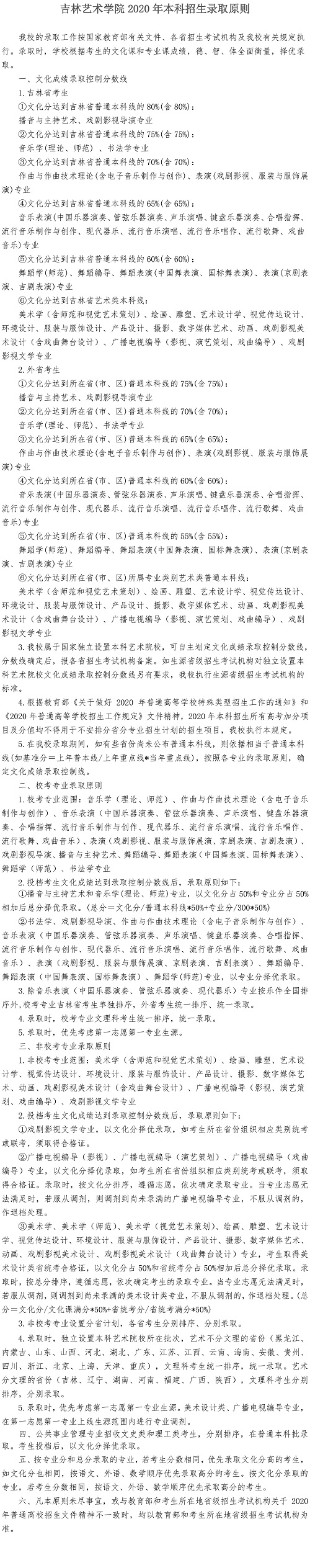 吉林艺术学院2020年本科招生录取原则