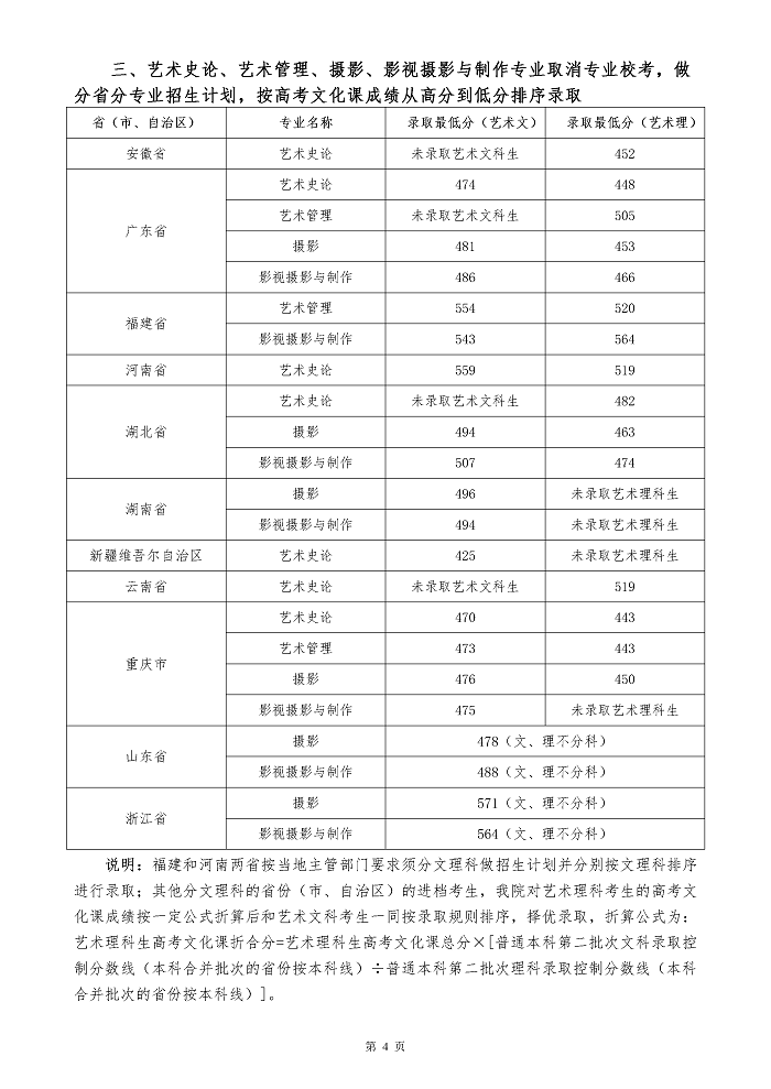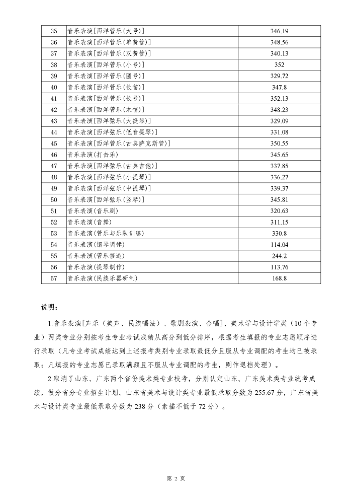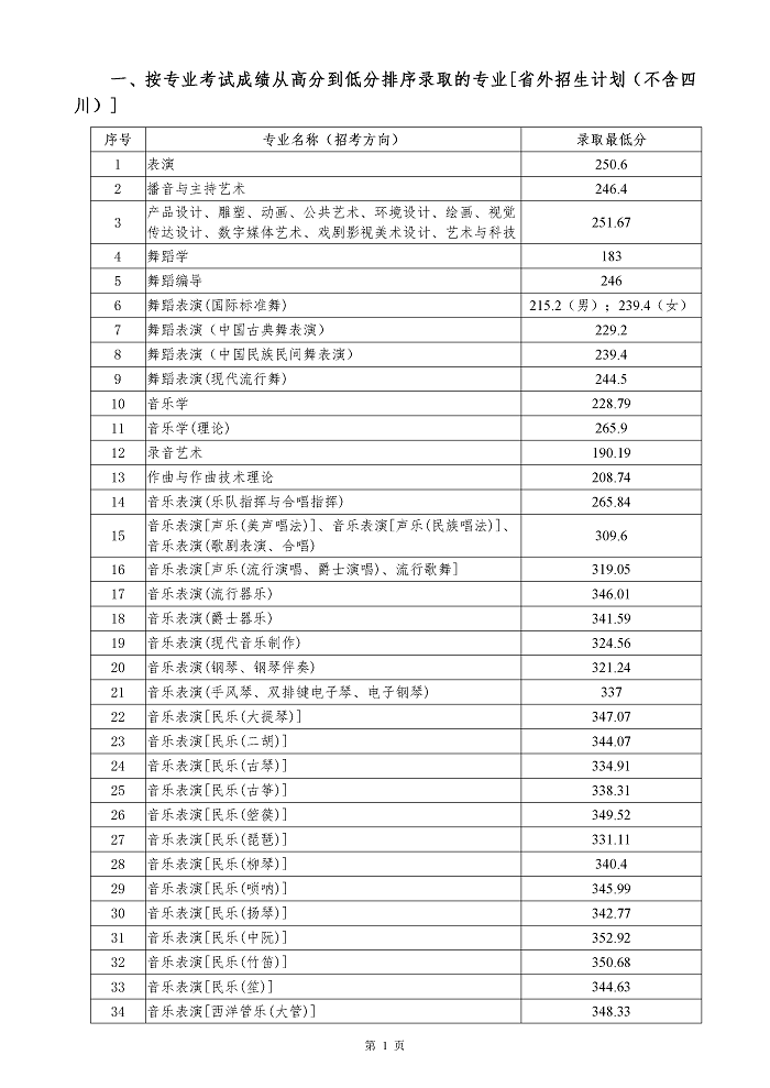 四川音乐学院2020年省外招生艺术类本科各专业录取最低分