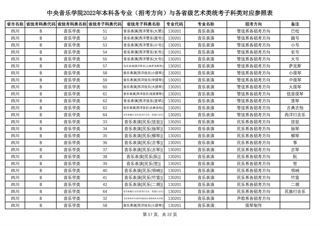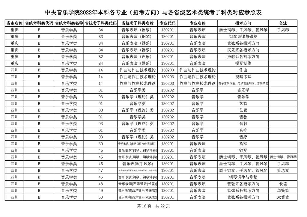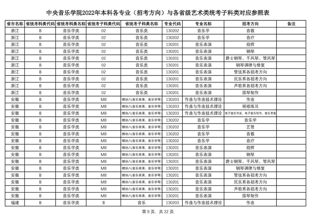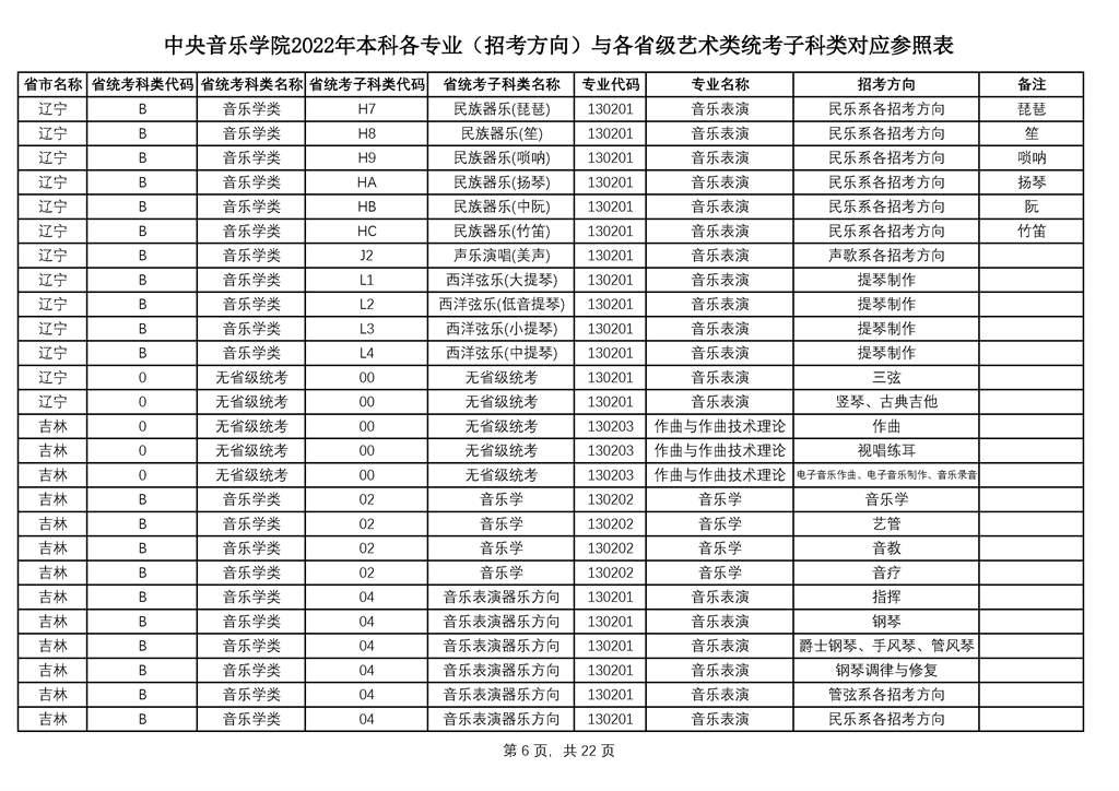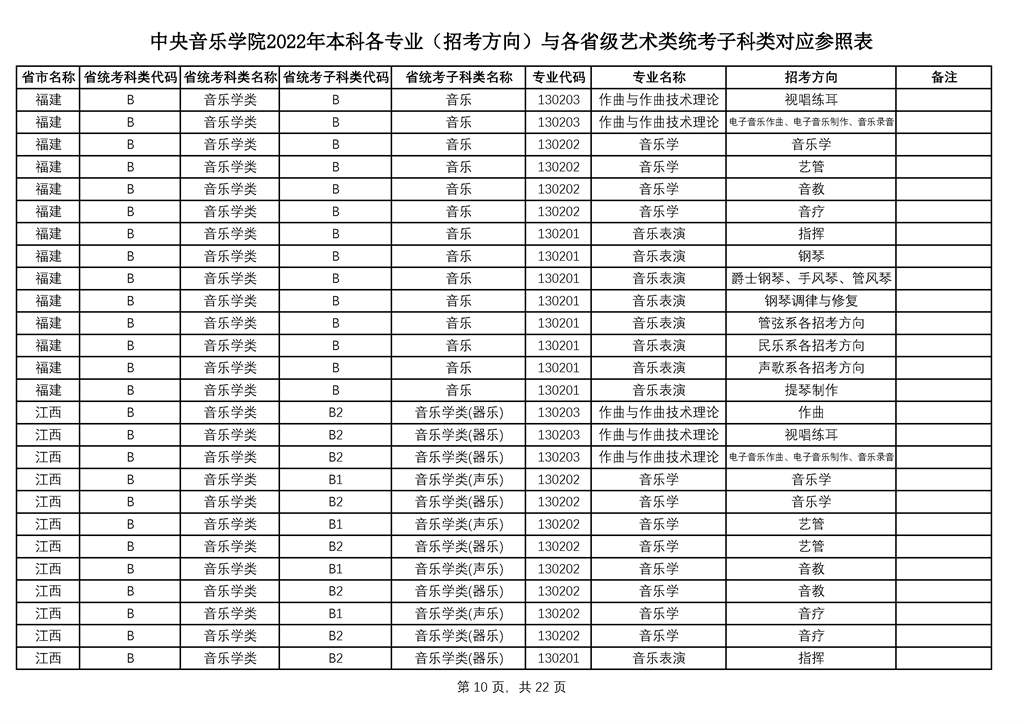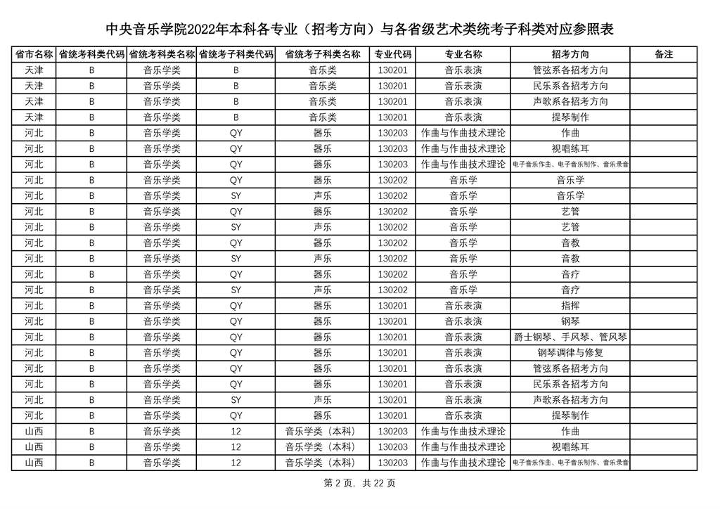 中央音乐学院2022年艺术类本科各专业(招考方向)