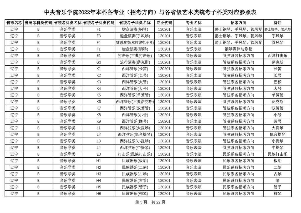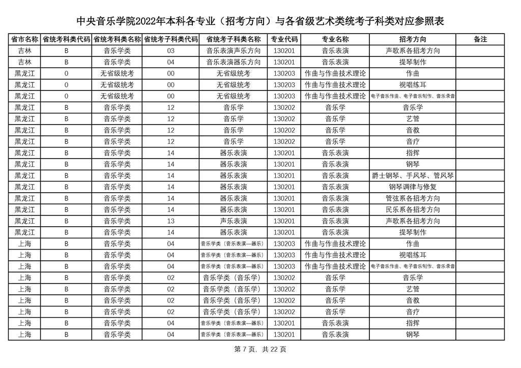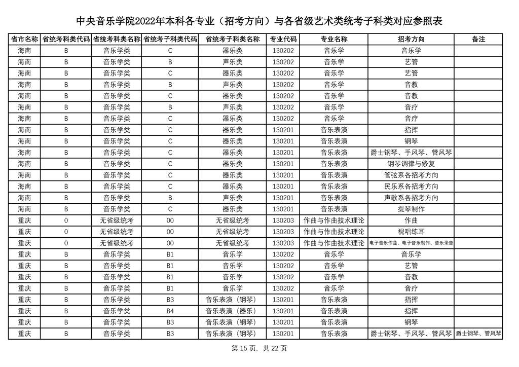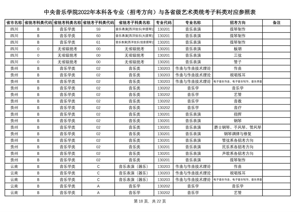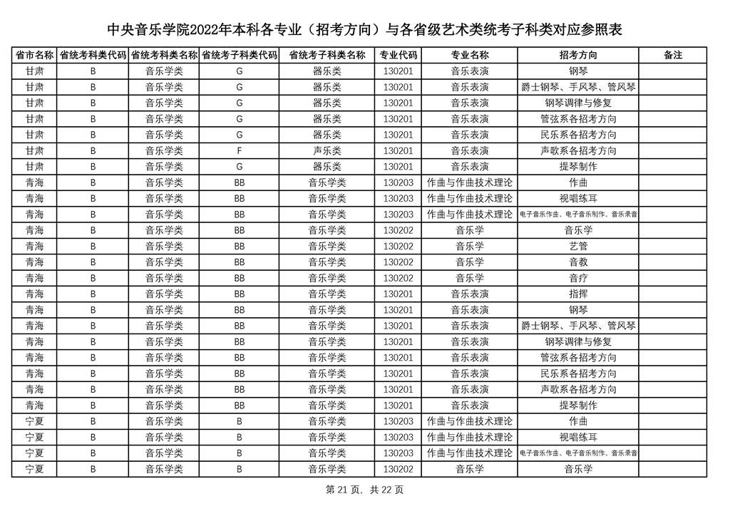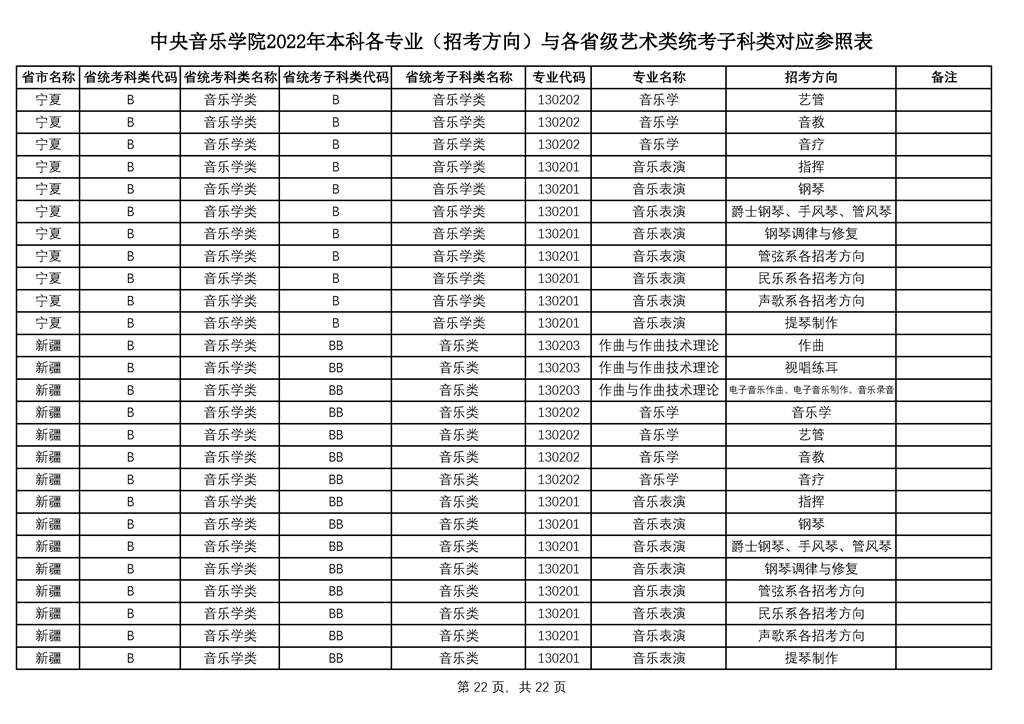 中央音乐学院2022年艺术类本科各专业(招考方向)