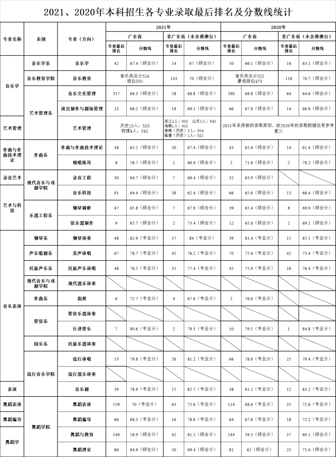 根据招生章程规定,广东省考生报考音乐教育专业执行广东省音乐类本科线,其余专业将根据生源情况自主划定专业分和高考文化成绩最低录取控制分数线。