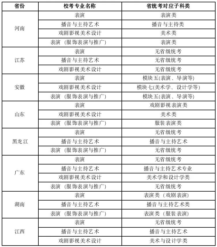 2.考生报考艺术统考涉及到的校考专业,须相应类别统考合格;省统考子科类为“无省级统考”的专业,考生无需省统考成绩;