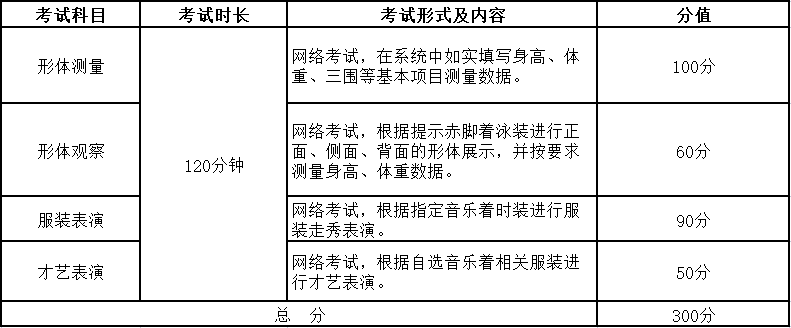 2.表演(服饰表演与推广)专业考试科目及分值(总分300分)