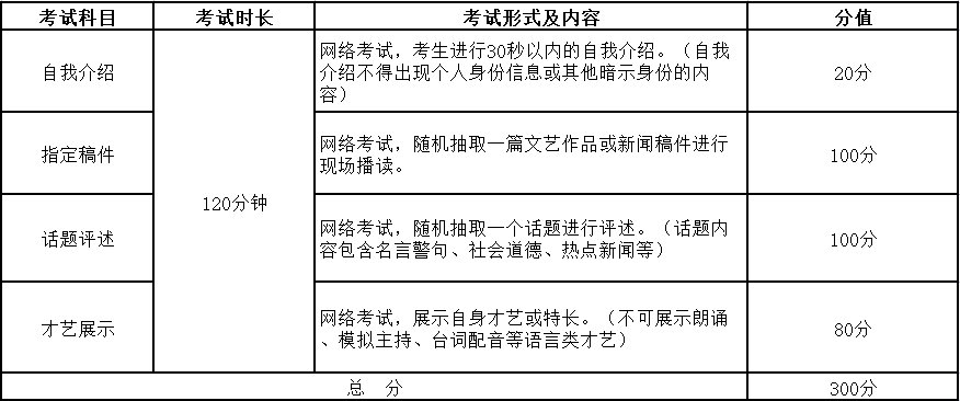 3.播音与主持艺术专业考试科目及分值(总分300分)