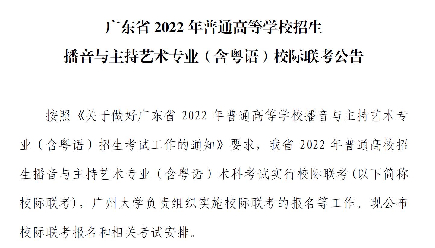 根据广东省教育考试院所下发的通知,广东省2022年播音与主持艺术专业将首次实行校际联考。