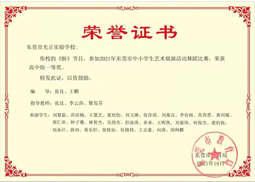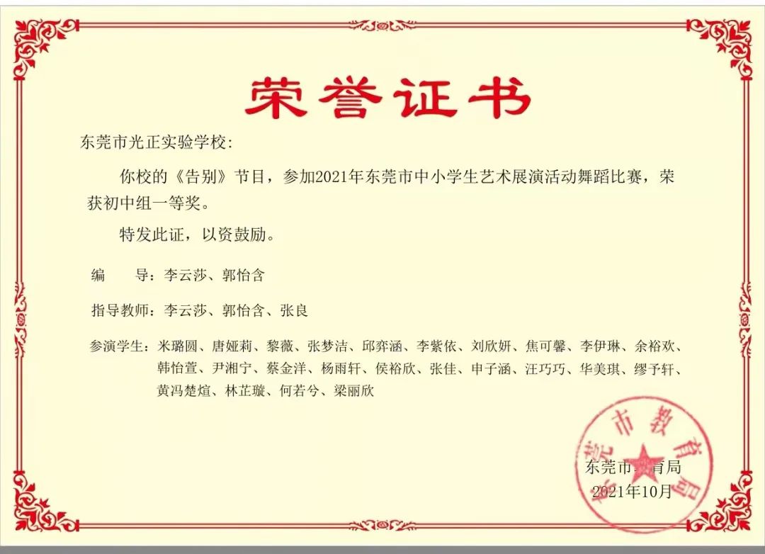 我校舞蹈队在各种大型比赛中成绩优异,2018年和2021年我校师生参加三年一届的东莞市中小学生艺术展演,蝉联两届冠军,2020年我校获评广东省艺术特色学校(舞蹈方向),曾代表茶山镇参加东莞市师生才艺展演、代表东莞市参加广东省中小学生艺术展演,获广东省青少年舞蹈大赛银奖。