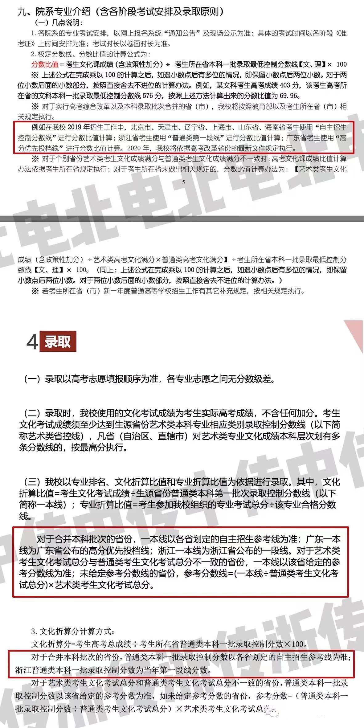 其次,对于本科批次合并的省份,艺术院校采取的办法是按照自主招生线(或者叫其他名字但总之是比合并后本科线更高的分数线)来作为划线依据。如图所示分别为北电、中传、浙传对分数线的解释。