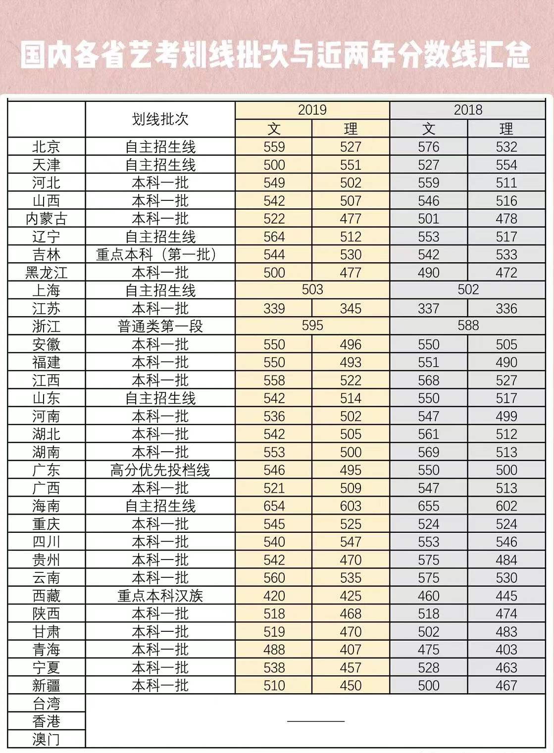 最后,这张图上是我给大家整理的,国内各省份划线批次及2018、2019年的分数线。