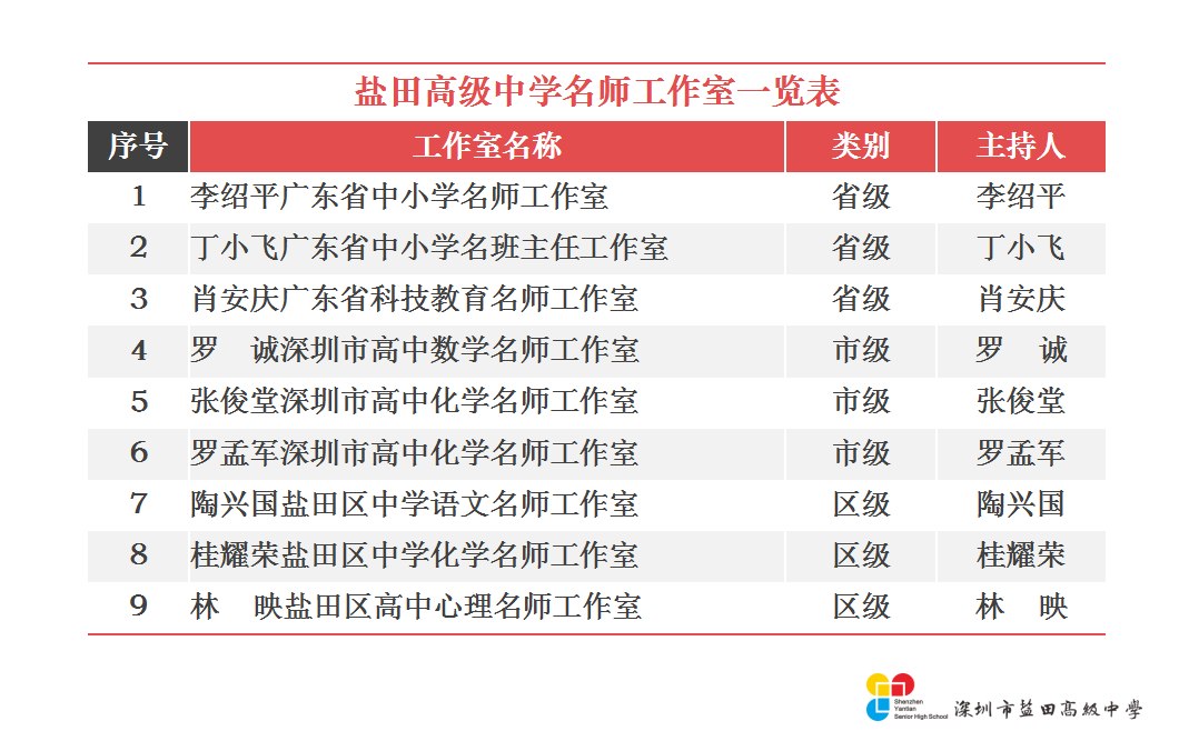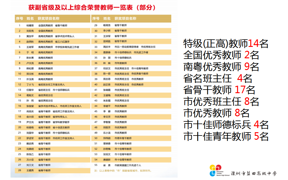 学校师资队伍实力雄厚,特级(正高)教师数量全市最多。依托强大的名师团队,盐高奋力打造“深圳名师团队第一品牌”。