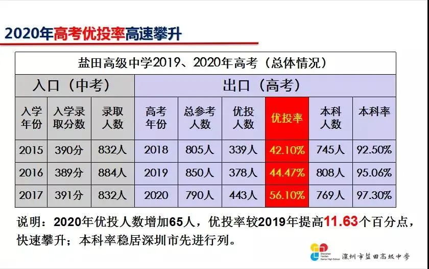 ★2020年优投人数增加65人,优投率较2019年提高11.63个百分点,快速攀升;本科率稳居深圳市最前列。