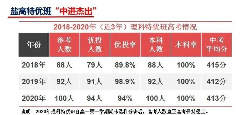 ★特优班一直是盐高的高考王炸,中考均分大致排在全市高中录取分数线15名左右,而优投率稳居90%以上,比肩“四大”的水平,完全是“中进杰出”的典范。