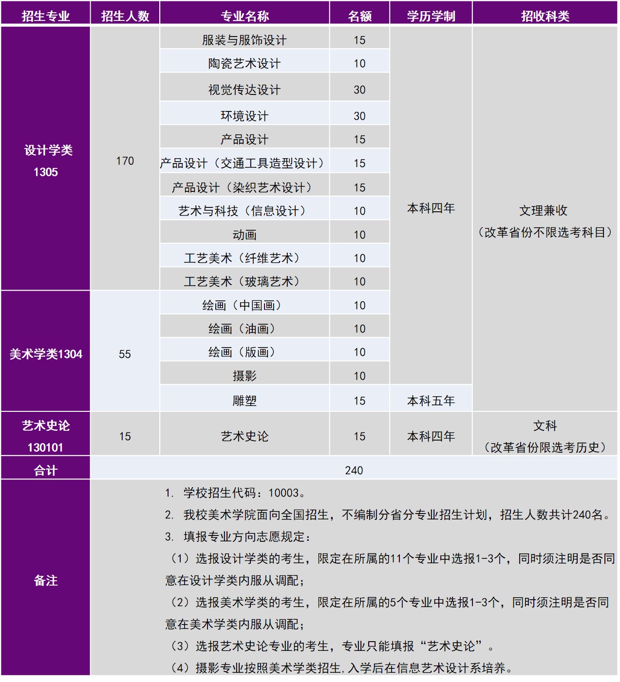 4. 报考我校艺术史论专业的考生,高考科目及满分值须与所在省文史类考生一致(不分文理的省份除外),高考改革省份选考必选科目要求为历史。报考设计学类及美术学类专业的考生,高考科目不做特别要求,按照所在省教育考试院要求执行。