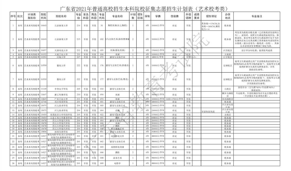 附件:广东省2021年普通高校招生本科院校艺术类校考征集志愿招生计划表
