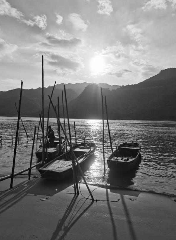 文字描述:夕阳下,江面波光粼粼,对岸山峦起伏。江边几艘灰蓝色的小船,一位渔夫正在劳作,船桅在黄色沙滩上投下影子。