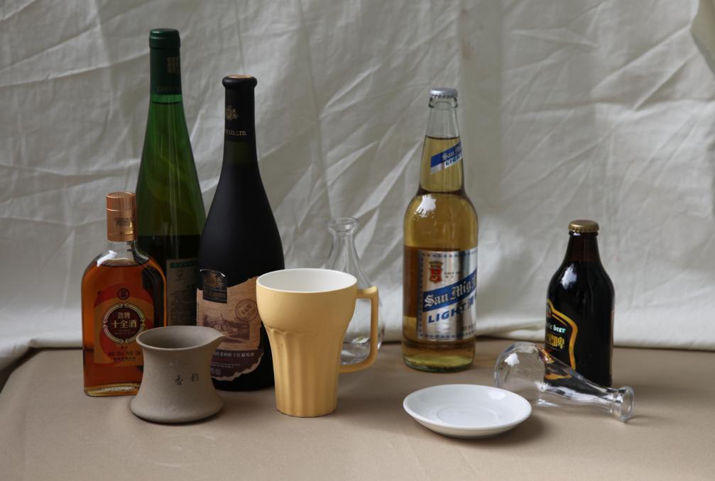 根据图片内容(10 件静物,1 块白色衬布,1 块灰黄色衬布),完成一幅色彩静物画。(可以重新组合构图,不得增加、减少或改变图片内容)