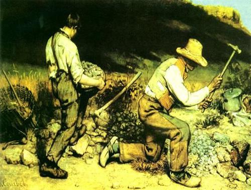 请以法国现实主义画家库尔贝的《石工》为构图和人物造型、道具细节的参考,置换人物身份、服装、道具及环境,画一张新版本的《工作的人》。要求造型风格写实,绘画手法不限。