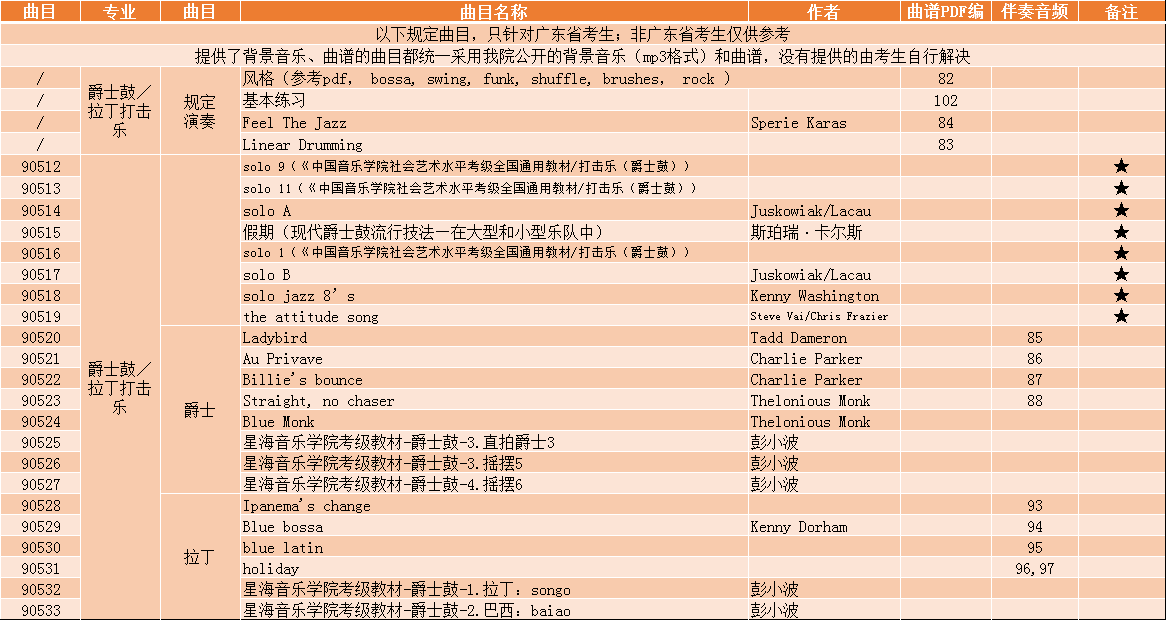 星海音乐学院流行器乐演奏爵士鼓拉丁打击乐本科招生规定曲目