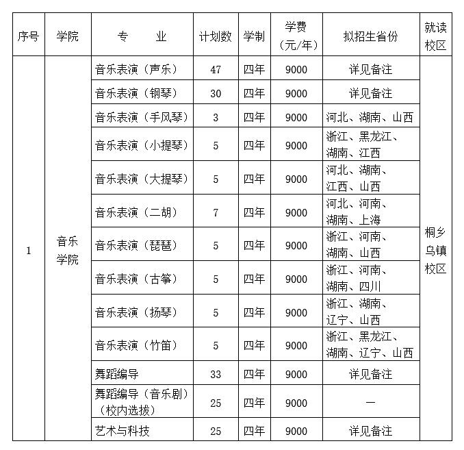 【注】:1.音乐表演(声乐)专业拟面向浙江、安徽、福建、广东、河北、河南、黑龙江、湖北、湖南、江苏、江西、辽宁、内蒙古、山西、上海、四川等16个省份招生,专业成绩承认相应省统考成绩。
