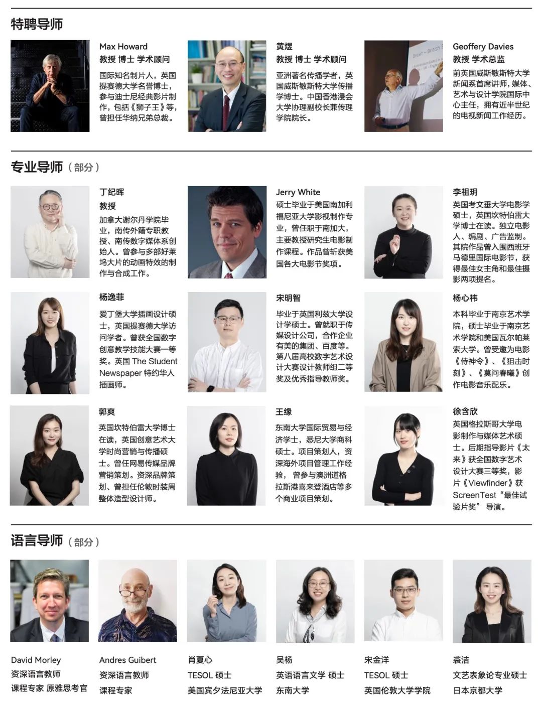 影视制作:该专业包含许多学习分支,如导演、制片、编剧、摄影、后期剪辑、影视特效制作等,学生将独立、合作拍摄他们属于自己的电影,并将参与数十部微电影拍摄和剧本的创作,尝试多种创作角色。影视专业实践是国际影视教学的重要组成部分,也是零距离接触行业的重要机会。