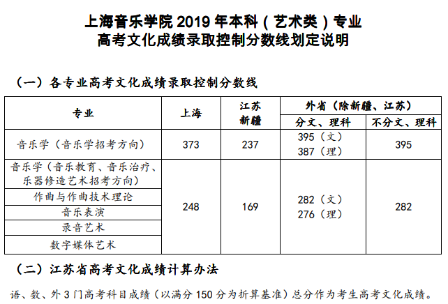 上海音乐学院2019年本科(艺术类)专业高考文化成绩录取控制分数线