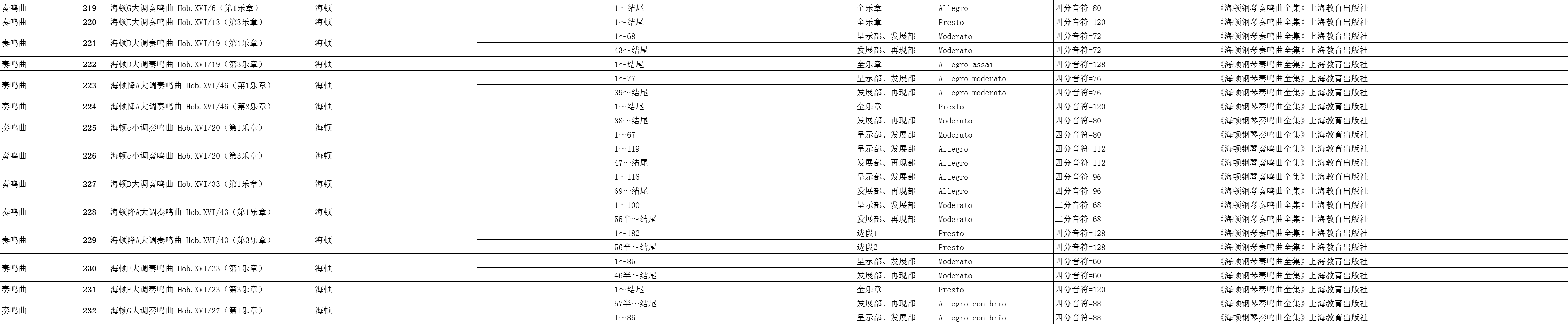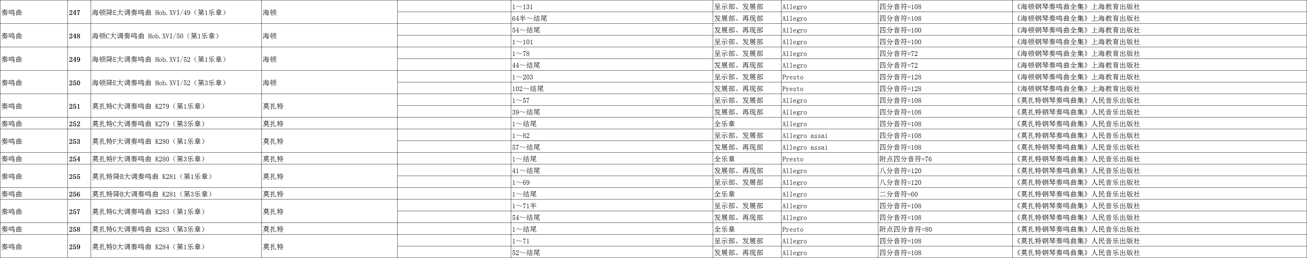 钢琴奏鸣曲规定曲目226 海顿c小调奏鸣曲 Hob.XVI/20(第3乐章) 海顿 1~119 呈示部、发展部 Allegro 四分音符=112 《海顿钢琴奏鸣曲全集》上海教育出版社