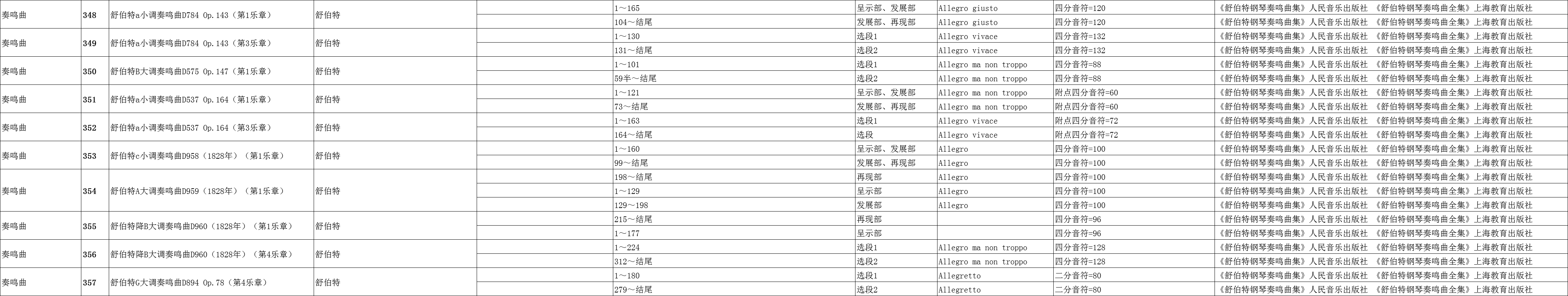钢琴奏鸣曲规定曲目340 舒伯特a小调奏鸣曲D845 Op.42(第1乐章) 舒伯特 1~144 呈示部、发展部 Moderato 二分音符=76 《舒伯特钢琴奏鸣曲集》人民音乐出版社 《舒伯特钢琴奏鸣曲全集》上海教育出版社